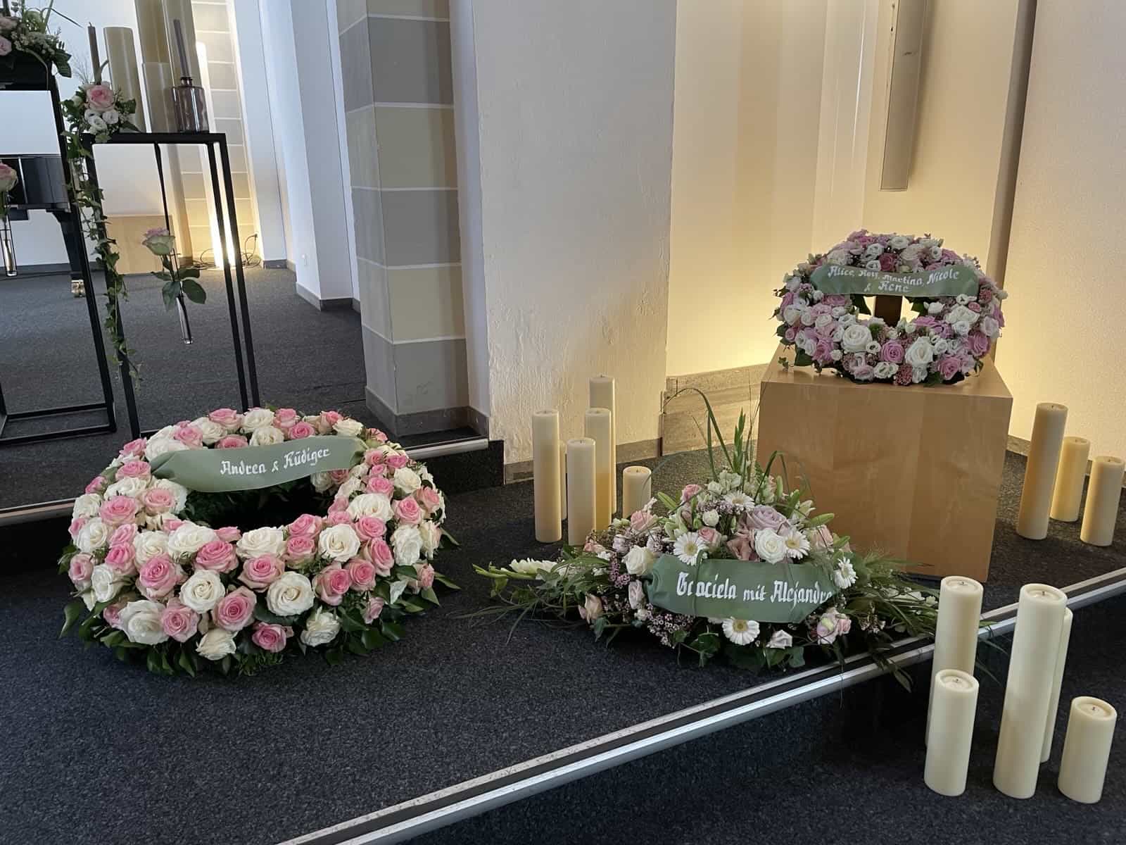 Blumen sagen oft mehr als tröstende Worte. Für den letzten Abschied gestalten wir mit viel Einfühlungsvermögen individuellen Blumenschmuck, der Ihre persönliche Anteilnahme ausdrückt. Ob Kränze, Gestecke, Urnenschmuck oder schlichte florale Arrangements, wir setzen Ihre Wünsche liebevoll um. Schauen Sie sich einige Beispiele an, und lassen Sie uns gemeinsam in einem persönlichen Gespräch die passende Gestaltung finden. Gerne stehen wir Ihnen für eine einfühlsame Beratung zur Verfügung.